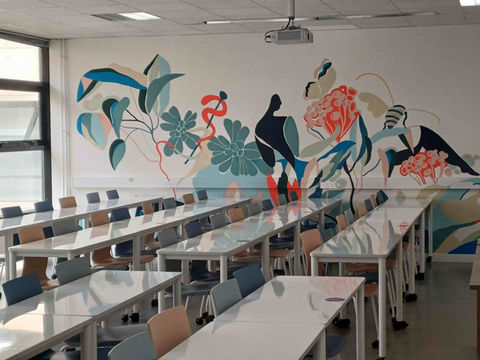 La Jolie Galerie est ravie d'avoir contribué à la transformation de la salle Pascal de l’Université de La Rochelle en "Smart Room" dédiée à la Licence Accès Santé (LAS). Cette fresque murale sur mesure et peinte à la main confère à cet espace une touche artistique unique et inspirante, parfaitement en harmonie avec son environnement pédagogique innovant.